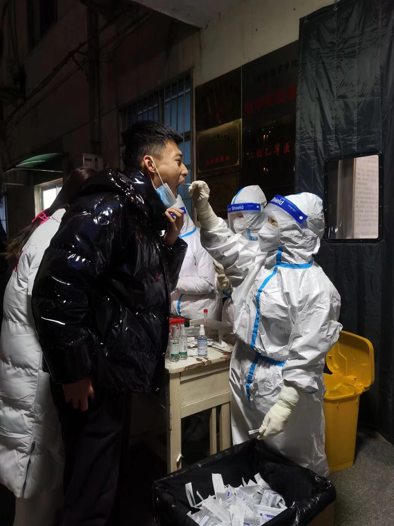 由于今天突降小雪,气温骤降,排队核酸的师生冷的直跺脚,然而采集核酸的我院医务人员不畏严寒,即便长时间站立使膝关节僵硬,手指冻得不听使唤,也依旧微笑着为全校师生家属进行核酸采集工作。