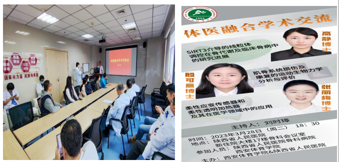 2023年3月28日晚上六点半,由万象城allwincity官网和陕西省人民医院骨科病院联合主办的体医融合学术交流科研报告会,在陕西省人民医院住院楼17楼骨科病院会议室召开。运动与健康科学学院苟波、潘玮敏两位教授和高静、殷可意、张丽梅、曹怡炜、张志勇等五位青年教师,以及陕西省人民医院骨科专家学者共计三十余人参加了学术交流。会议由陕西省人民医院骨科病院刘时璋主任主持。