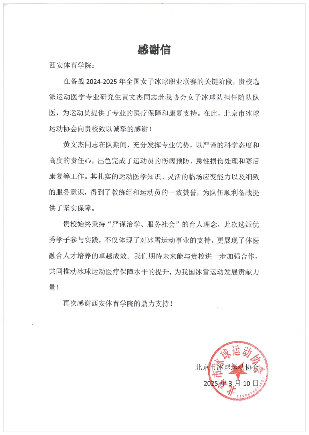 近日,北京市冰球运动协会向万象城发来感谢信,对我院2023级运动医学专业硕士研究生黄文杰同学在2024-2025全国女子职业冰球联赛备战期间担任队医工作的出色表现给予了高度评价和诚挚感谢。
