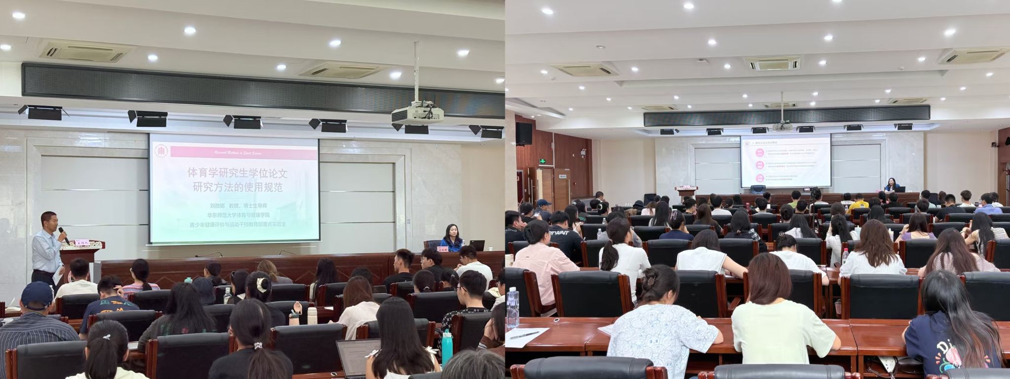 讲座期间,刘微娜教授以体育学研究生学位论文撰写为核心主线,系统剖析论文中常见的方法学问题,结合盲审与抽检的实际案例,明确论文质量管控的关键环节;针对文献法、问卷调查法、实验法等体育学科常用研究方法,全面讲解其界定标准与规范应用原则;围绕科研伦理主题,强调学术研究中伦理规范的重要性,特别提及IRB申请相关要求。互动交流环节,现场师生就讲座核心内容踊跃提问,刘微娜教授逐一细致解答,既涵盖理论层面的深度分析,也包含实操层面的具体指导,现场学术氛围浓厚。