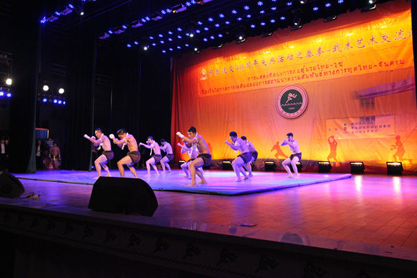 当天晚上,泰国泰拳专业队和我院武术运动员在艺术馆大礼堂为观众上演了两国武艺国粹,让大家切身感受到泰拳的魅力和中国武术的博大精深。泰拳选手的飞肘、飞膝无不令观众喝彩,他们的动作连贯性很强,飞肘加鞭腿相当迅速,动作潇洒,且击打威力极大。泰拳选手编创的节目形式多样,观赏性强,还穿插了许多剧情,使在场观众对泰拳及泰国文化有了更广泛的兴趣。泰拳表演之后,我院武术系学生还奉献了精彩的武术表演:南拳气势磅礴,吐气发力,稳桥硬马,博得了一个开门红。红拳凛然风骨形意进退生威,太极拳内外兼修、刚柔相济,劈挂拳长刁冷抽、吞吐开合,翻拳短打紧密、双拳翻飞,中国传统刀剑劈、刺、崩、斩、截,虎虎生风,天岐棍在长短兼施中搬、砸、扭、扣,倏忽变化……十多种武术一一登场,体现了中国武术丰厚的文化意蕴。武术系主任马文国在现场中英文解说,也博得观众阵阵喝彩。