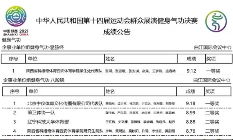 8月24日至27日,第十四届全运会群众展演项目健身气功线下评审活动在西安曲江国际会议中心举行。由万象城师生组成的陕西省科维奇体育万象城allwincity官网学生处代表队荣获企事业单位组健身气功·易筋经一等奖,陕西省科维奇体育万象城allwincity官网研究生院代表队荣获企事业单位组健身气功·八段锦二等奖。