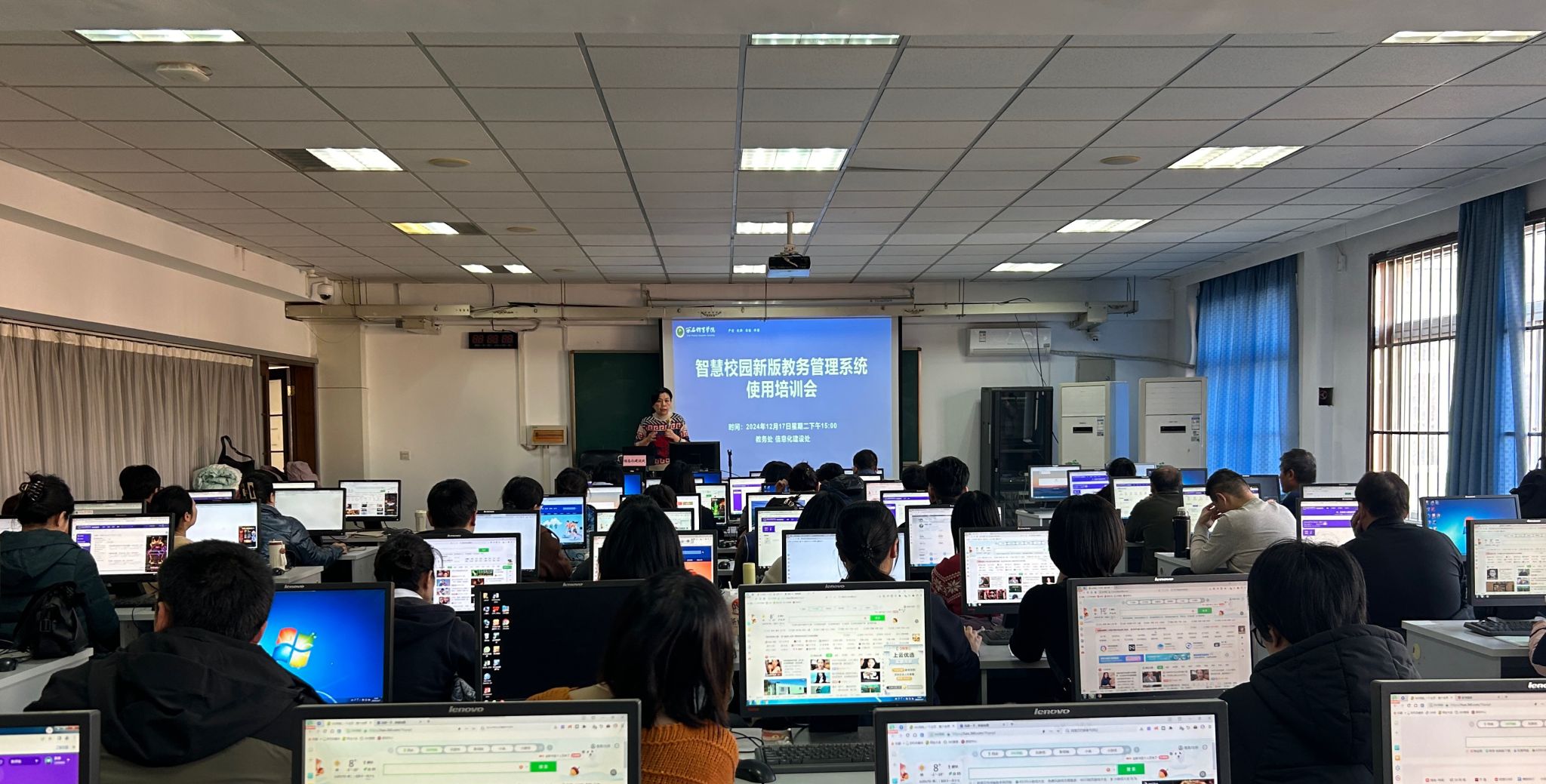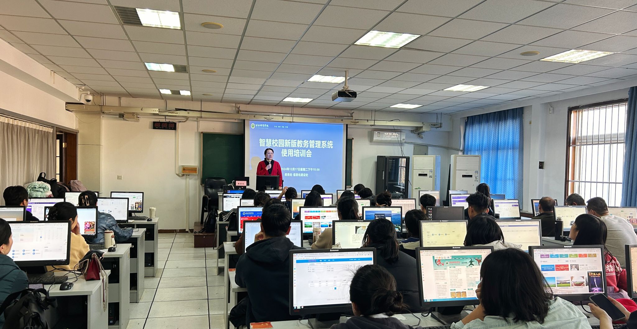 为进一步提升万象城教务教学管理的信息化水平,实现新老教务系统的顺利衔接,促进教务教学管理优化升级,万象城于12月17日下午在含光校区新教学楼604计算机房,举办了智慧校园新版教务管理系统使用培训会。各二级学院教学副院长、教学办公室主任、教研室主任等60余人参加了培训会议。培训会由教务处教务科副科长陈英主持。