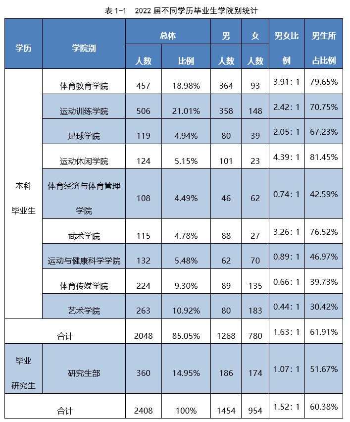 从表中可知,男生共有1454人,占总人数的60.38%,女生共954人,占总人数的39.62%,男女比约为1.52:1。其中六个学院和研究生部的男生比都超过50%,分别是体育教育学院、运动训练学院、足球学院、运动休闲学院、武术学院、研究生部。