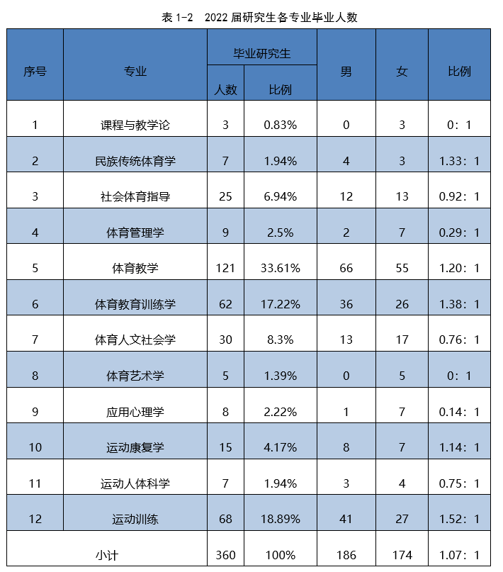 涉及16个本科专业(方向),12个硕士专业(方向)。本科毕业生人数超100人的有5个专业(体育教育专业、运动训练专业、武术与民族传统体育专业、舞蹈表演专业、播音与主持专业)。本科专业涵盖新闻学、经济学、心理学、艺术学、管理学等学科门类,研究生专业涵盖体育教育训练学、体育管理学、应用心理学等学科门类。