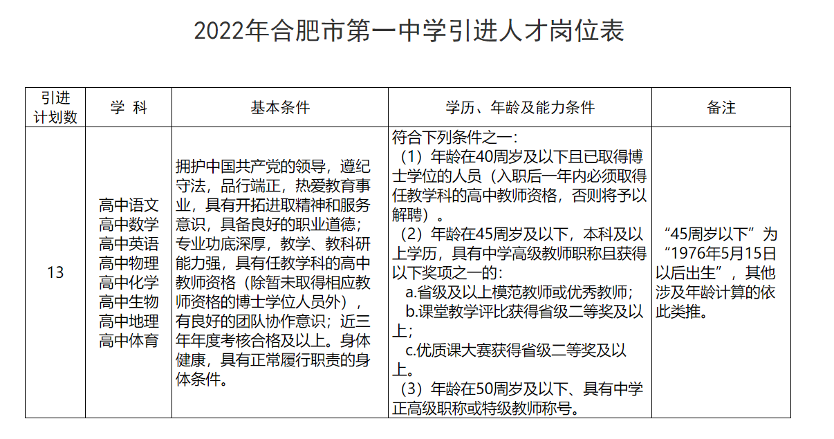 为加强高素质专业化创新型教师队伍建设,经批准,合肥市第一中学面向全国公开引进13名优秀教育人才。具体方案如下: