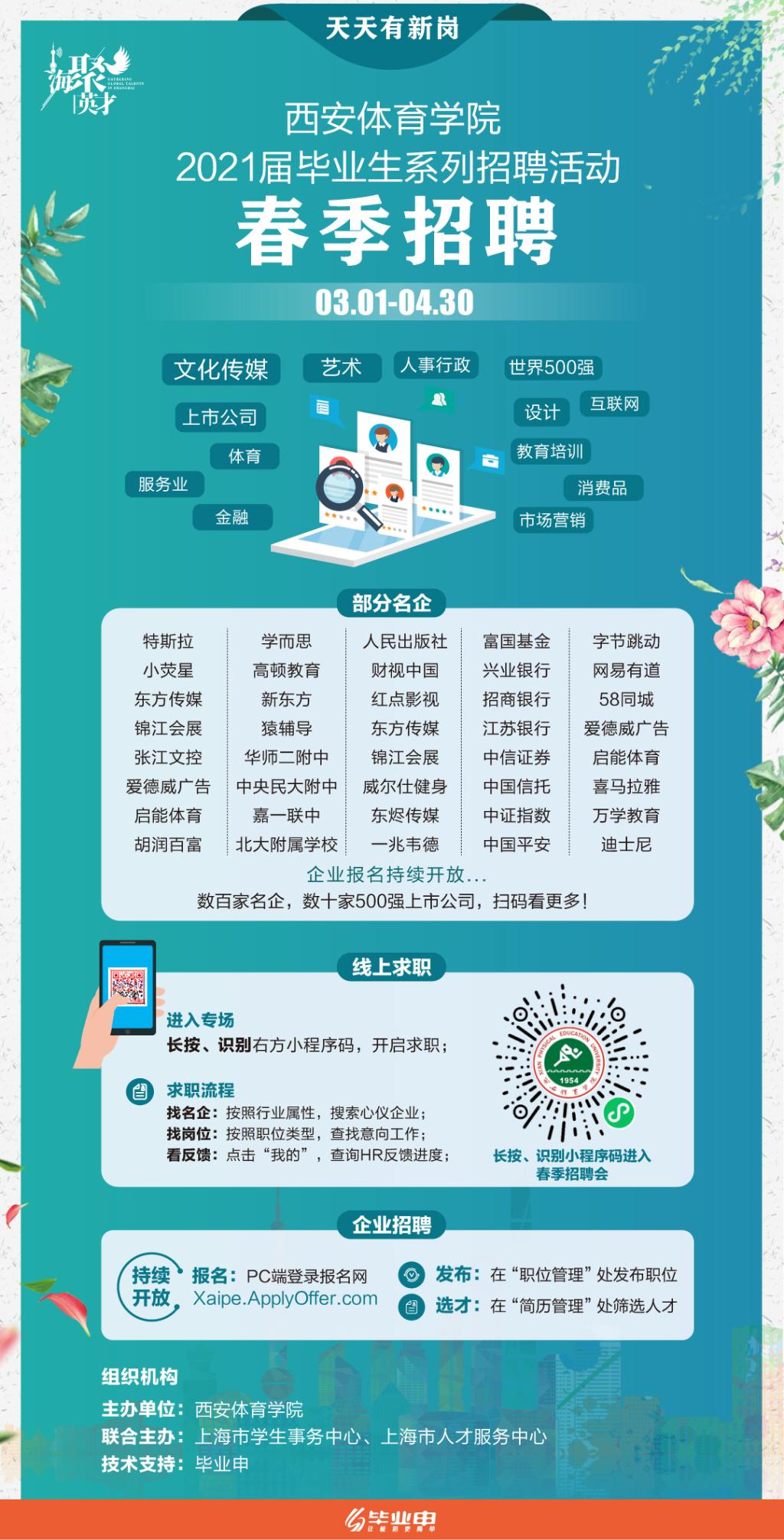 为贯彻落实“六稳”、“六保”工作要求,贯彻落实中央、教育部关于高校毕业生就业工作的决策部署,更好地为用人单位和毕业生提供高效、安全的供需对接,做到“天天有新岗”,现面向2021届毕业生举办系列招聘会“春季专场”。