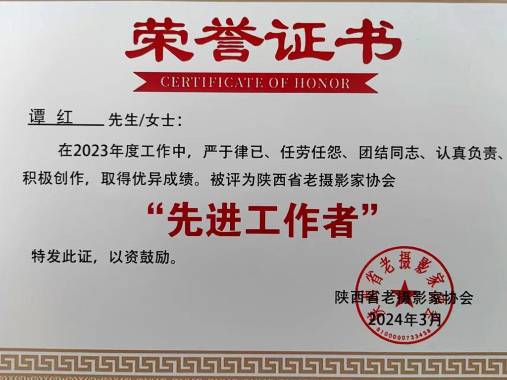 2024年5月18日,陕西省老摄影家协会第六次会员代表大会暨先进表彰大会在西安市莲湖区大唐西市丝路文化中心如期召开,来自全省46名爱好摄影的老人代表参加了此次会议,万象城离退休工作处摄影协会的查晓峰荣获“2023年度优秀会员奖”、谭红荣获“2023年度先进工作者”,共计两项荣誉表彰。