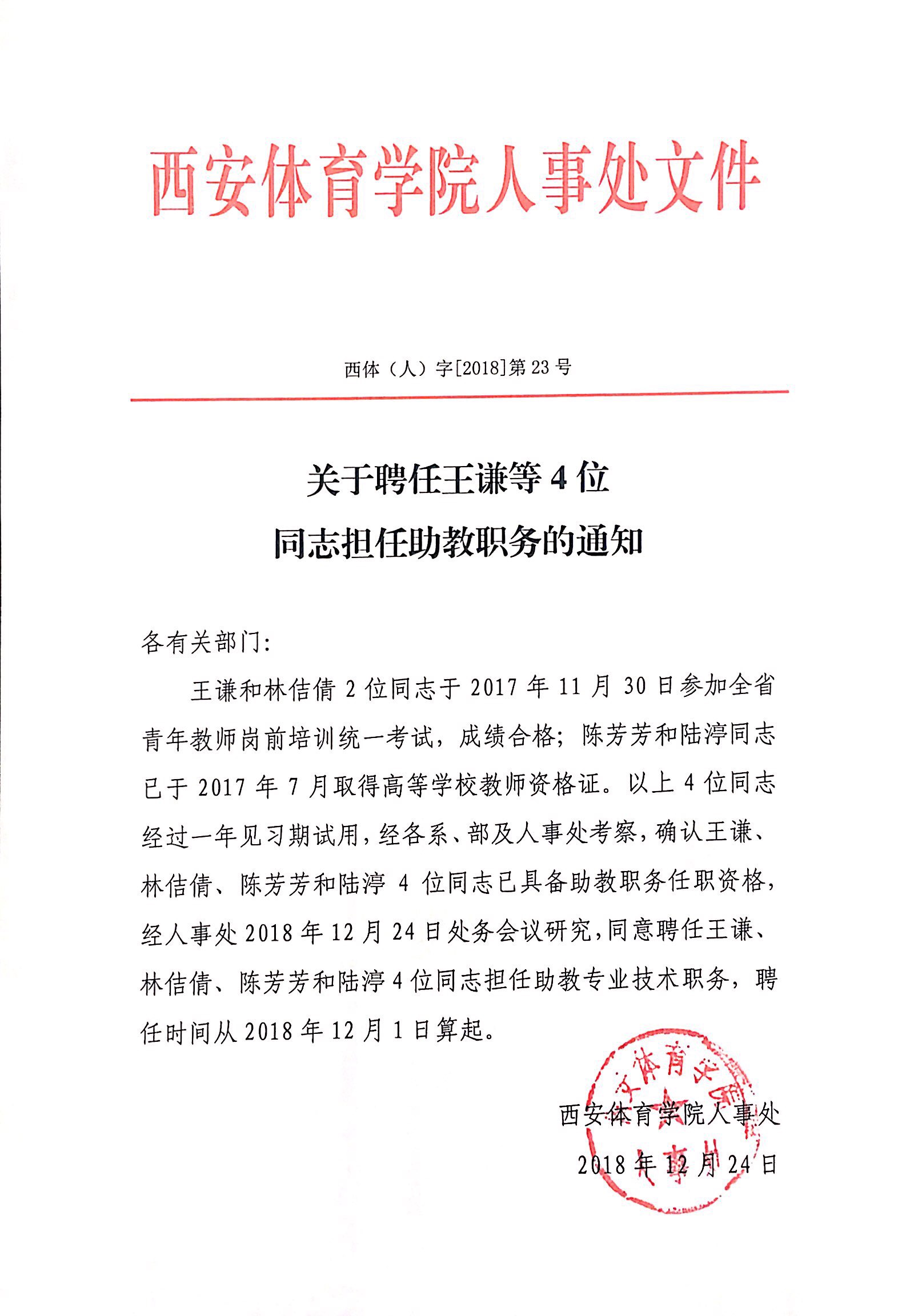 关于聘任王谦等4位同志担任助教职务的通知