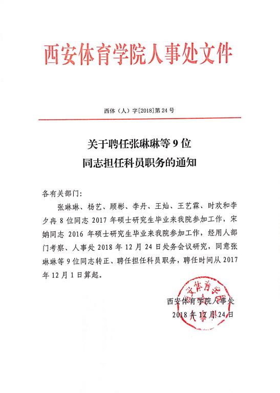 关于聘任张琳琳等9位同志担任科员职务的通知