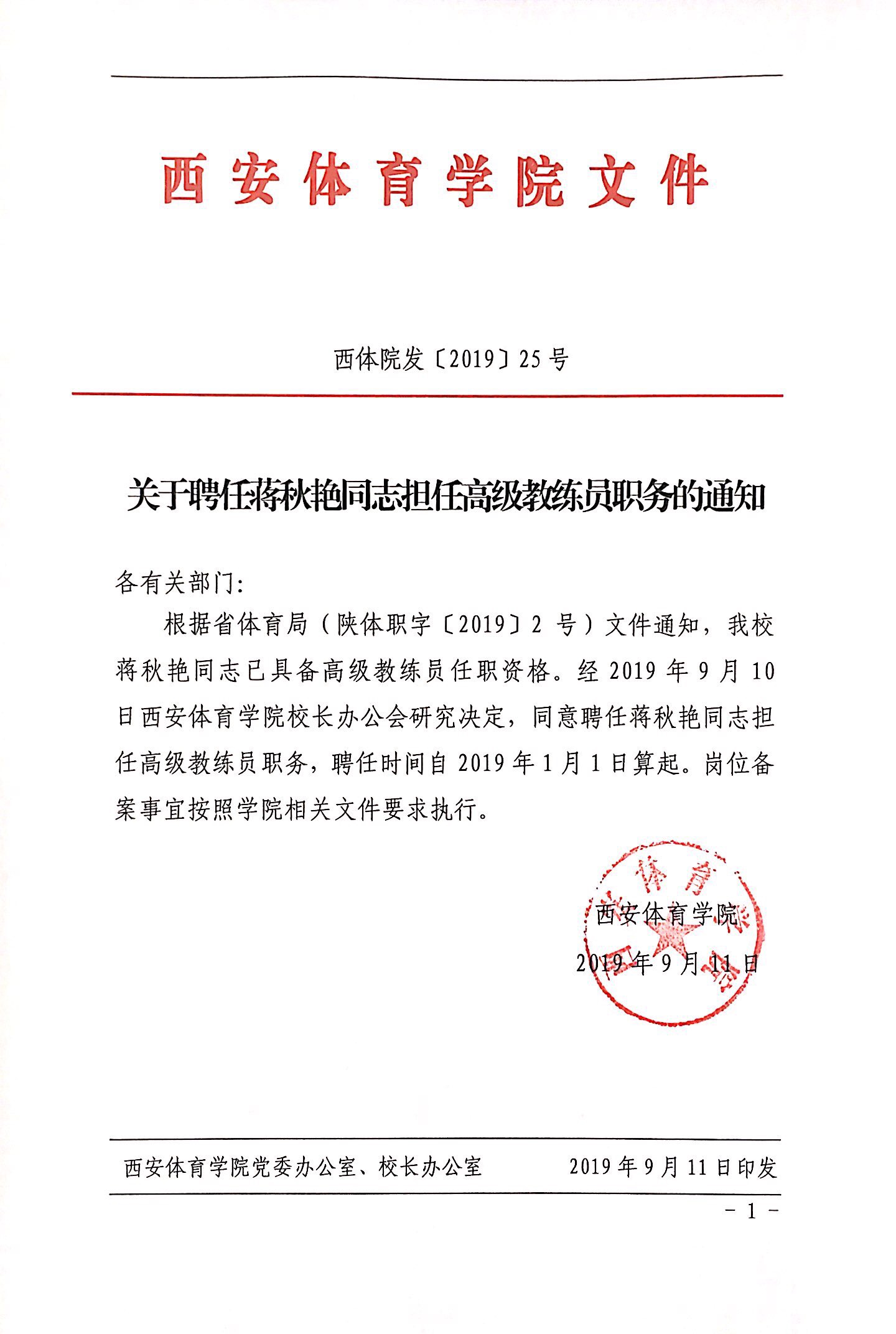 关于聘任蒋秋艳同志担任高级教练员职务的通知