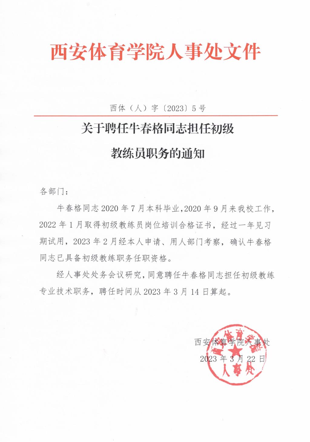 关于聘任牛春格同志担任初级教练员职务的通知