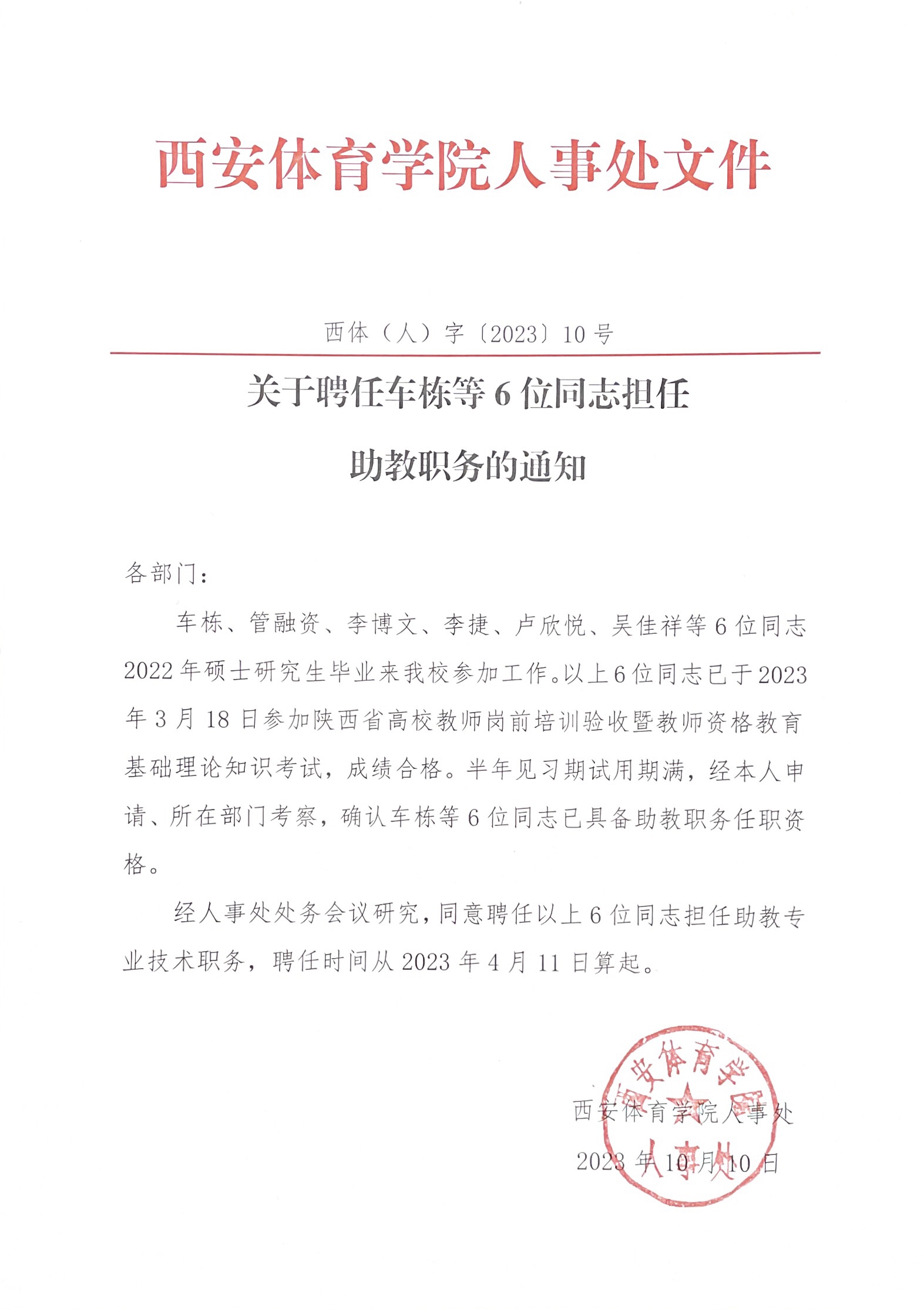关于聘任车栋等6位同志担任助教职务的通知
