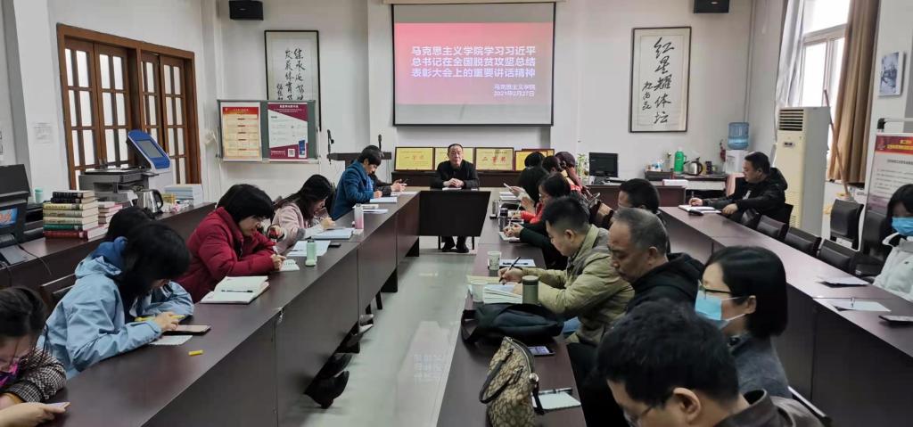 马克思主义学院于2月27日上午在图书馆资料室集中学习习近平总书记2月25日在全国脱贫攻坚总结表彰大会上的重要讲话精神。 大家深受鼓舞、倍感振奋,纷纷表示将立足本职岗位,以脱贫攻坚楷模、先进个人、先进集体为榜样,胸怀祖国和人民,以攻坚克难、不懈奋斗的精神,为全面推进乡村振兴,巩固拓展脱贫攻坚成果,建设社会主义现代化国家贡献自己的绵薄之力。
