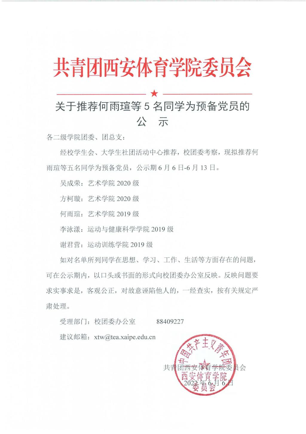 关于推荐何雨瑄等5名同学为预备党员的公示
