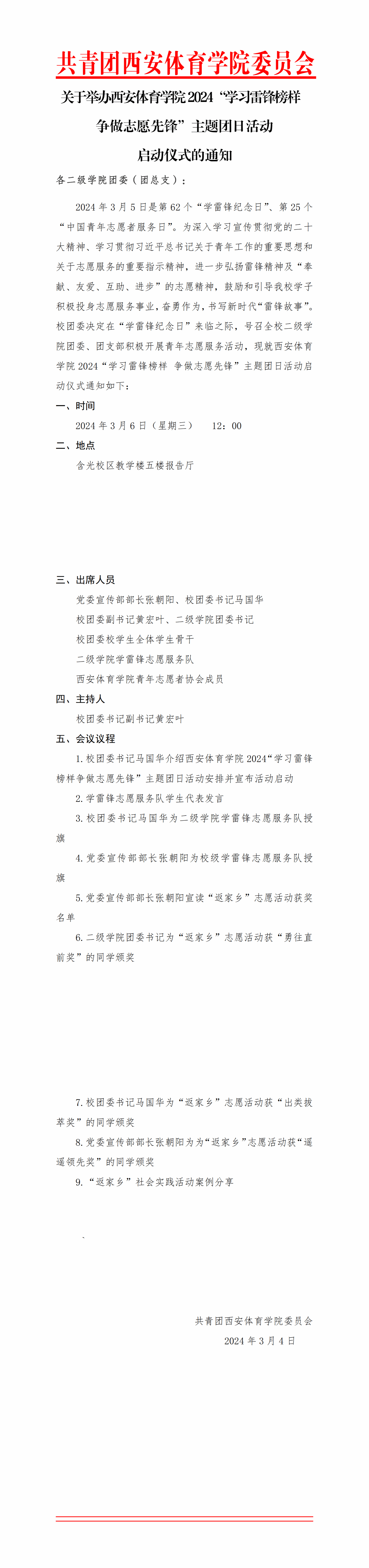 关于举办万象城allwincity官网2024“学习雷锋榜样 争做志愿先锋”主题团日活动 启动仪式的通知