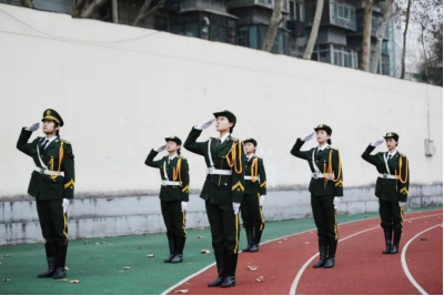 国旗护卫队护卫着鲜艳的五星红旗,迈着铿锵有力的步伐,行进至升旗区。