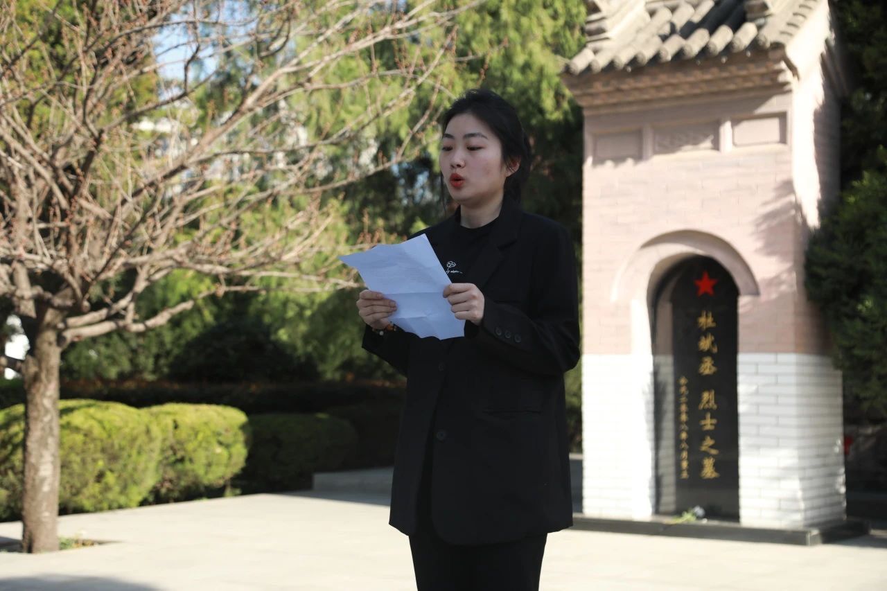 学生代表刘妍贺带领全体同学重温入团誓词,铿锵誓言回荡在陵园上空,传递着青年学子继承先烈遗志、勇担时代重任的坚定信念。