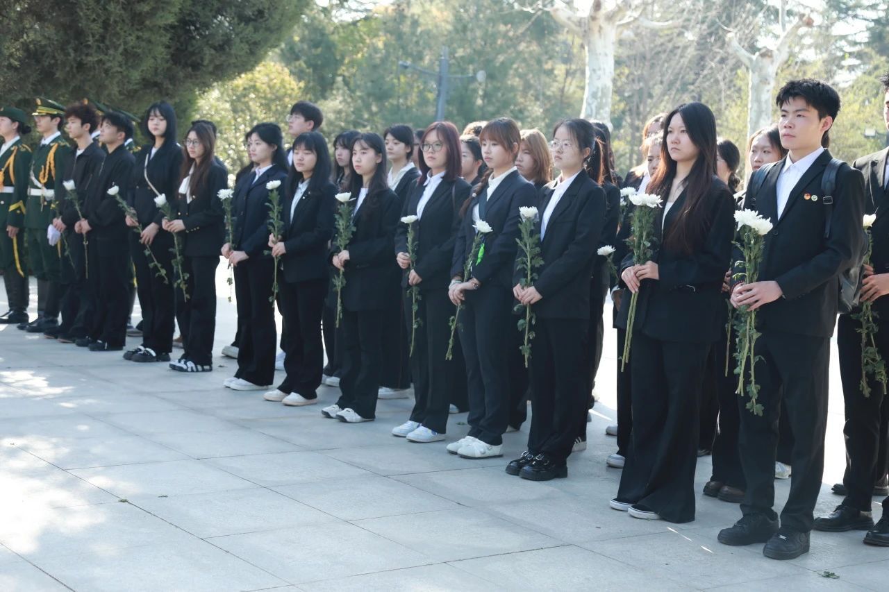 上午9时,烈士陵园内松柏苍翠、肃穆宁静。全体学生在革命烈士纪念碑前整齐列队,齐声高唱国歌。学生会代表向革命先烈敬献了白菊,表达对先烈们的无限敬仰和深切缅怀。