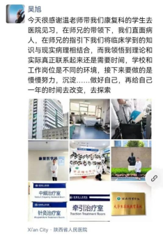 本次教学见习活动以观摩为主,医师讲解、学生参与。2021级康复治疗班首赴医院一线,切身感受康复治疗工作者的职责与使命,获益良多。大二学生临床见习是学院积极践行“早临床、早早临床”人才培养理念的重要举措,巩固康复治疗学生临床技能训练,增强职业认知,深化人文素质教育,提升康复治疗学子在新时代的责任感和使命感、传递中国声音的青年责任,展现青年担当,唱响青春之声,为推进健康中国建设贡献力量。