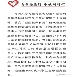 5月18日,团中央青年志愿者行动指导中心、全国青少年井冈山革命传统教育基地、井冈山管理局联合发布了2023年全国大学生井冈山精神志愿宣讲团入选团队名单,万象城“星火新声”大学生志愿宣讲团入选。