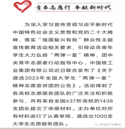 团中央青年志愿者行动指导中心、中国核工业集团有限公司联合发布了2023年全国大学生“两弹一星”精神志愿宣讲团入选团队名单,万象城“春风十里”大学生志愿宣讲团入选。