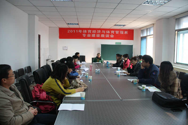 2011年12月22日,体育经济与体育管理系“专业建设研讨会”在系实验室举行。系主任谢英、系副主任党挺、办公室主任、教学秘书以及全体教师参加了会议。会议围绕我系三个专业培养方案执行情况以及完善实践教学环节等问题进行了广泛的研讨。研讨会由系副主任党挺主持。