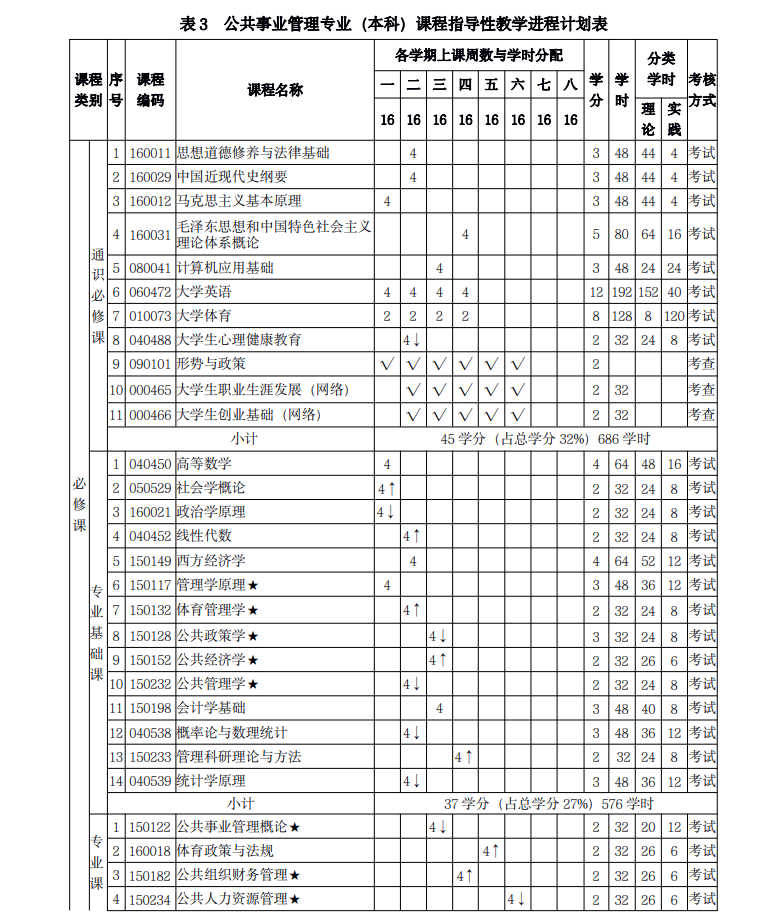 九、公共事业管理专业(本科)课程指导性教学进程计划表(见表 3)