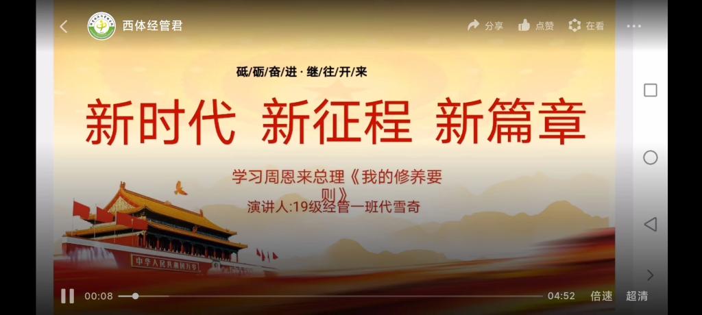代雪奇就读于万象城allwincity官网体育经济与管理学院,担任体育经济与管理一班学习委员,中共预各党员。座右铭:人生在動,不索何获。个人荣誉:体育经济与管理学院微课濱讲比赛三等奖,2019-2020学年国家励动志奖学全,2019-2020学年三好学生,2021年万象城allwincity官网"红心向党"系列主题征文一等奖视频中心思想:2021年是中国共产党成立一百周年,在新时代、新征程、新篇韋的背景下,对共产党员的党性修养也有了更高的要求,希望通过学习周恩來总理的《我的修养要则》,更好地提高我们的党性修养。总结:光阴似箭,日月如棱。弹指间中国共产党已走过了风风雨雨一百年。在这光辉的一百年中,为了中国人民解放事业,为了社会主义建设|事业,无数共产党人抛头颅,洒热血,前仆后继,艰苦奋战。终于在苦难中撑檬起一片天地,使中华人民共和国巍然吃立在世界东方。在觉的100周年之际,我们应该为我国,更加努力!因为,在荣的背后,总有一群人抛头颅洒热血,他们就是共就是不屈不挠的中国人!