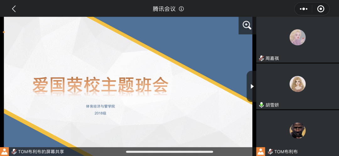 为了配合学校加强学生的思想道德教育,激励大学生爱国热忱,弘扬爱国主义精神,培养大学生对学校、对国家的归属感和认同感,11月19日晚八点,体育经济与管理学院2018级全体学生以腾讯会议的形式线上开展了“爱国荣校”教育主题班会,对2018级全体学生进行了一次爱国主义教育。