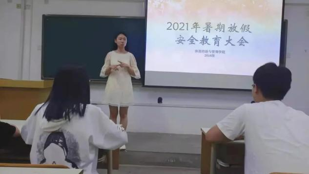 为提高学生们的安全防范意识,构建安全校园体系,切实做好安全防范工作,体育经济与管理学院于2021年6月30日在教学楼召开了暑期放假安全教育大会。本次会议由学生辅导员胡雪妍老师主持,体育经济与管理学院2018级全体学生参加。