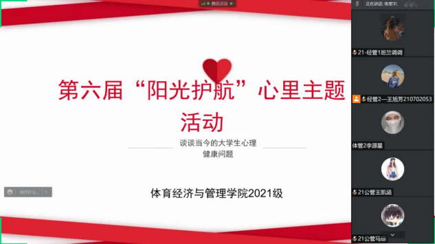 此次宣讲活动由霍达老师和张星宇老师组织开展,在霍达老师与张星宇老师带领下,体育经济与管理2021级全体学生观看了心理健康教育视频。此次会议中,霍达老师向同学们讲解了情绪是如何产生的,不同情绪产生的原因,以及如何避免出现负面情绪,如何正确调节已出现的不良情绪等问题。同时表示,自己会给予学生力所能及的帮助,帮助我院学子解决心理问题。
