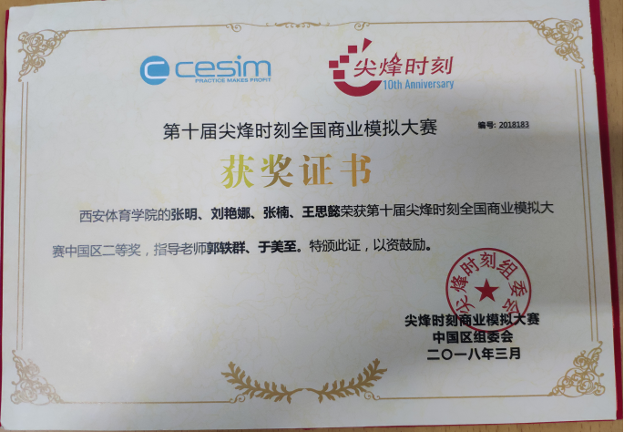2018年3月举办的第十届尖峰时刻全国商业模拟大赛,该赛事源于来自北欧的全球知名商科模拟大赛PEAK TIME。自2008年引入中国后,已在中国成功举办了十届全国比赛,吸引了全国各地130多所院校,累计数万名学生参赛。尖烽时刻已成为国内一项知名度颇高的国际性商业模拟赛事。赛事致力于提高学生商业技能的综合运用能力与软技能,让学生享受学习带来的快乐。通过赛事,让学生得以接触国际优秀的教学资源,同时拥有更多国际院校的交流沟通的经验,并分享国内外模拟教学的经验。