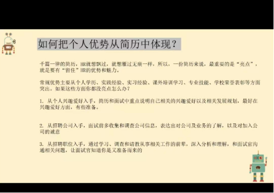 韩超超老师向大家讲授了招聘面试中的技巧。韩老师主要从:面试前的准备、面试时的问题应对、可能会问到的问题这三个方面向同学们作了详细地指导。接着罗贤忠老师向同学们讲授了如何制作个人简历、投递简历。在会议中罗老师还挑选了一些简历的案例,分析它们的优缺点,使同学们能够更加清楚地学习到如何把个人优势从简历中体现出来。两位老师在人力资源方面都有着丰富的经验,此次会议中他们从如何制作个人简历、如何把个人优势从简历中体现、如何投递简历、招聘方想看到什么、面试技巧辅导以及求职岗位方向指导六个方面为同学们进行授课,使大家受益匪浅。