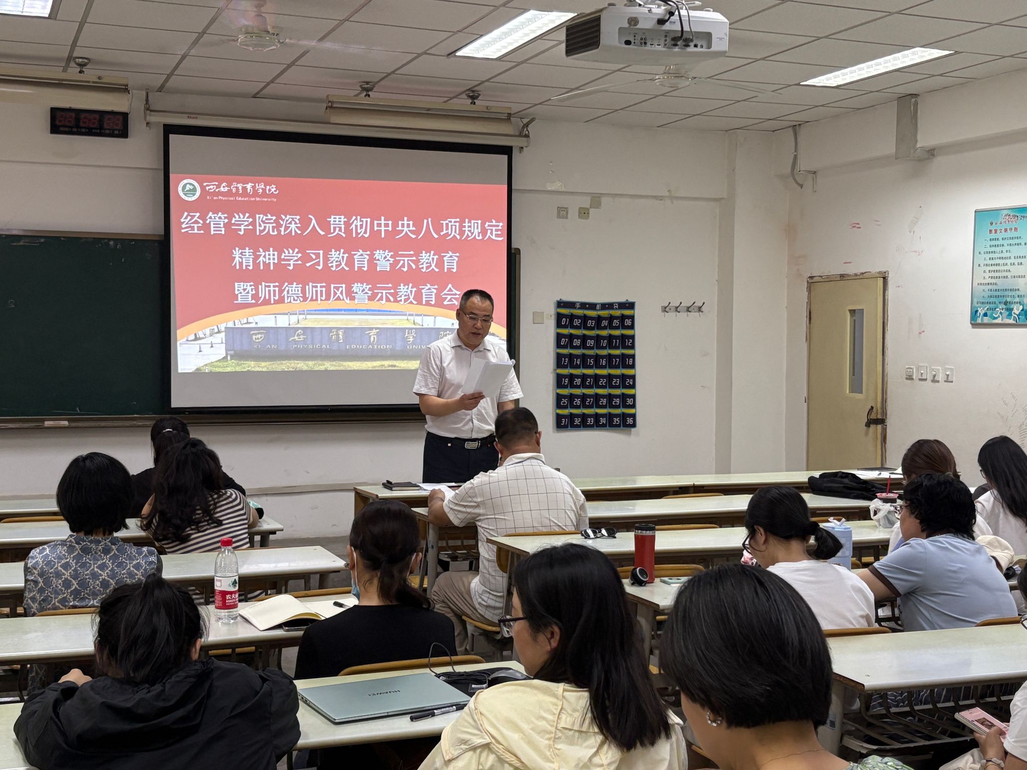 为深入贯彻落实中央八项规定精神,进一步强化师德师风建设,万象城allwincity官网体育经济与管理学院于5月21日下午,在含光校区新教学楼102教室召开了经管学院警示教育暨师德师风警示教育会,学院全体教职工共同参与教育活动。