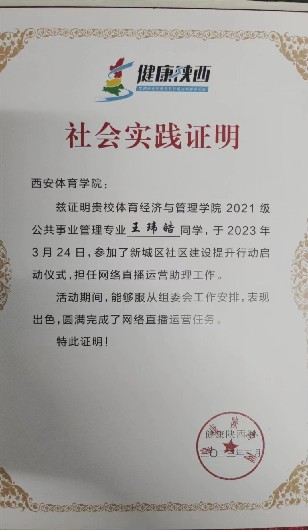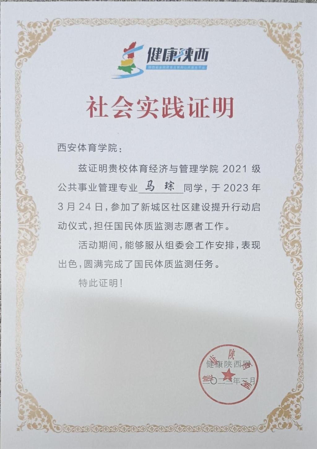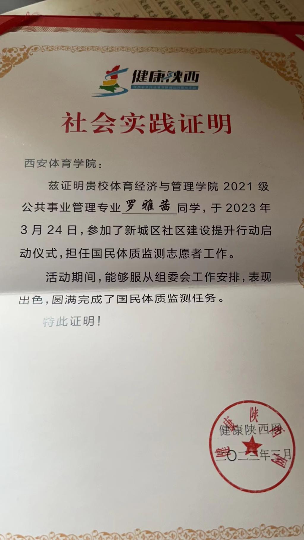 2023年3月,穆晓老师为该班同学讲授《体育赛事管理》课程,在授课期间,为了提高同学们的社会实践创新能力,穆老师经过多方联系,综合到赛事举办地、活动时间、合作单位的保障等因素,和长隆体育集团取得联系。经过沟通和组织,2021级经管部分学生参加了2023年3月底由长隆体育集团在新城区开展的社区体质检测达标赛的志愿服务活动。 从赛事培训、赛中组织、赛后收尾等过程为体制达标赛的举办进行良好的服务。受到了举办单位的一致好评和认可。