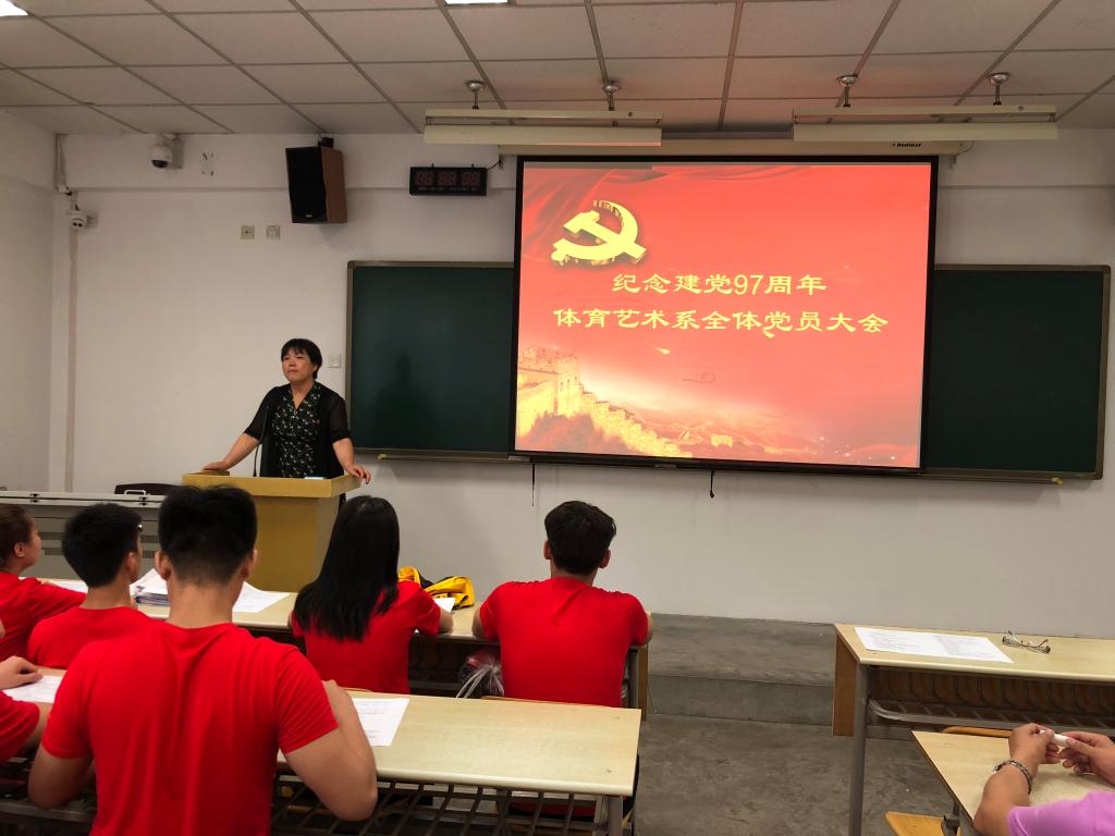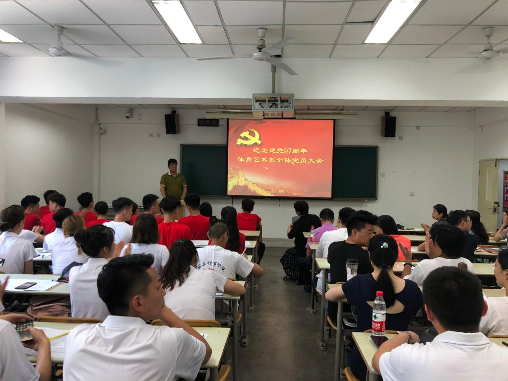 为庆祝中国共产党成立97周年,充分发挥基层党组织和全体党员在工作中的引领和先锋模范作用,引导教育全系党员强化党性修养,2018年6月28日中午,体育艺术系在新教学楼307教室召开庆祝建党97周年体育艺术系全体党员大会。本次大会由体育艺术系主任赵志伟主持。