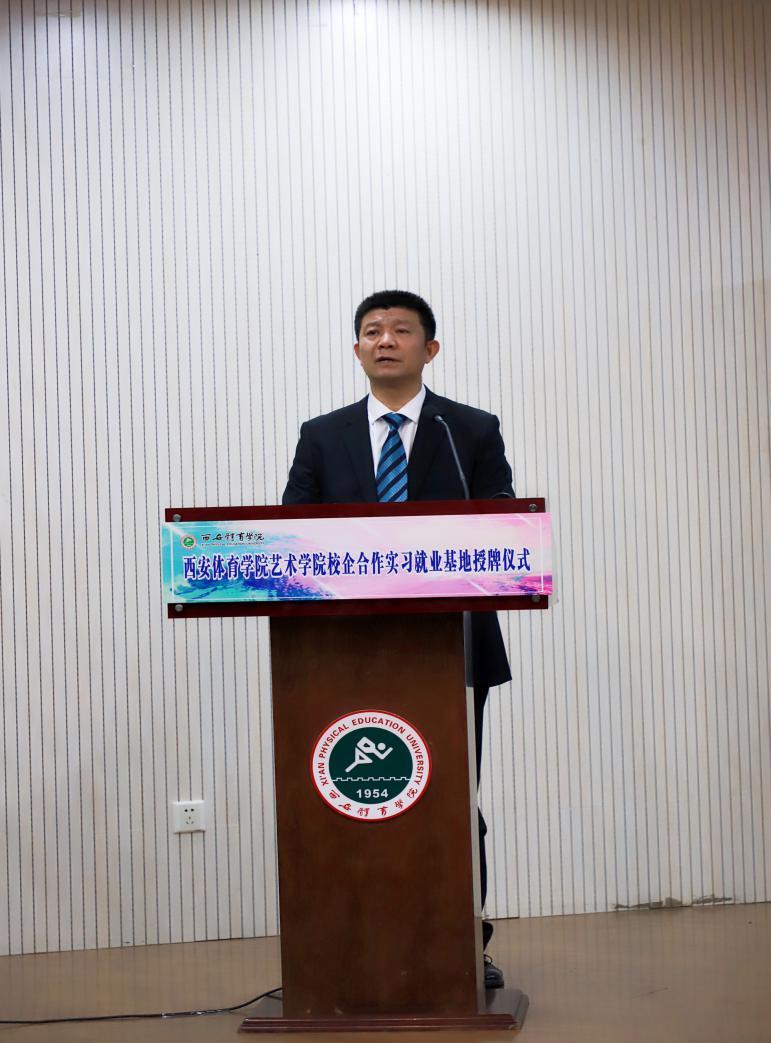活动伊始,艺术学院院长杨占军代表艺术学院对出席本次仪式的领导、嘉宾表示感谢,他在致辞中首先对艺术学院各项历史与情况作了简要介绍,并且对实习就业基地与艺术学院合作模式提出了几点意见,他说:建立就业实习基地是学生培养与社会融合的需要,艺术学院与各用人单位要加深合作,共同开创实习就业双融合模式,不断加强毕业生理论与实践融合程度,逐步推进毕业生融入社会的能力。艺术学院高度重视与各合作单位共建实习就业基地,规范化、系统化建立实习就业基地,校企双方需不断加深双边合作,不断深化其内涵、丰富其内容、扩大其成果,共同开创校企合作新局面,为推进落实党中央“六保”“六稳”工作要求不断努力,共同开创万象城就业工作新蓝图!