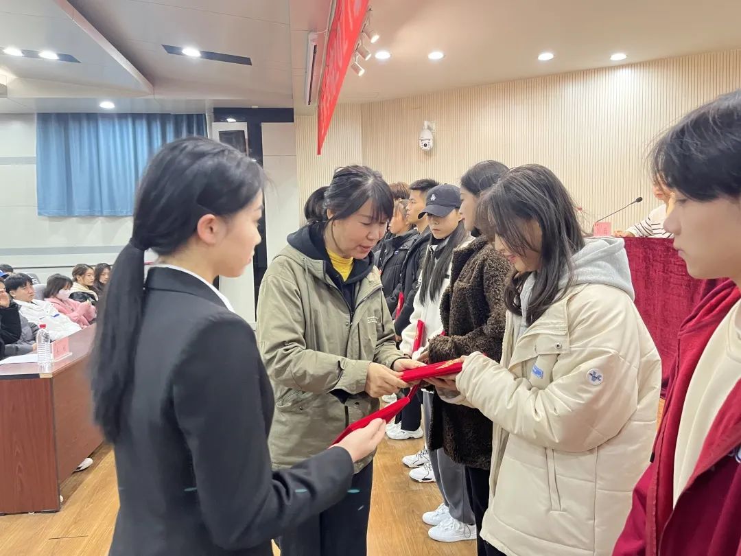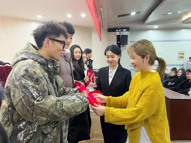 艺术学院学工办主任兼团委书记黄宏叶为军训感言主题征文比赛优秀奖同学代表颁奖