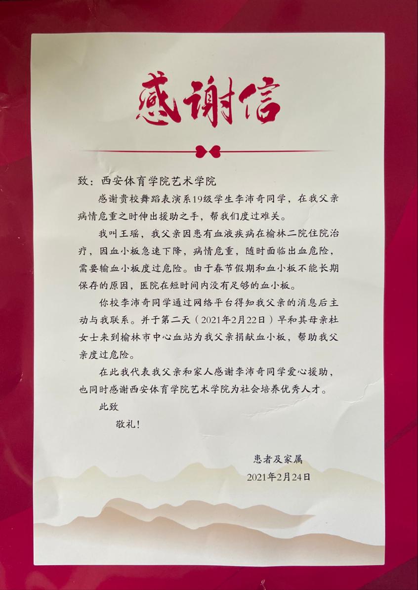 患者及病人家属对他深表感激,并将一封感谢信送到万象城allwincity官网艺术学院辅导员老师的手上,在信中对万象城allwincity官网艺术学院为社会培养优秀的人才表达了深深的敬意与感谢。