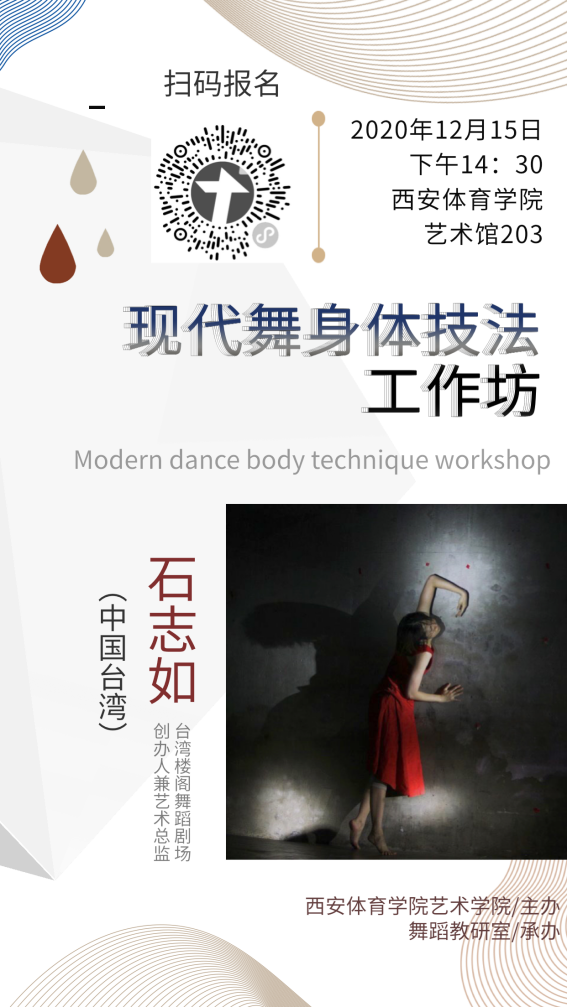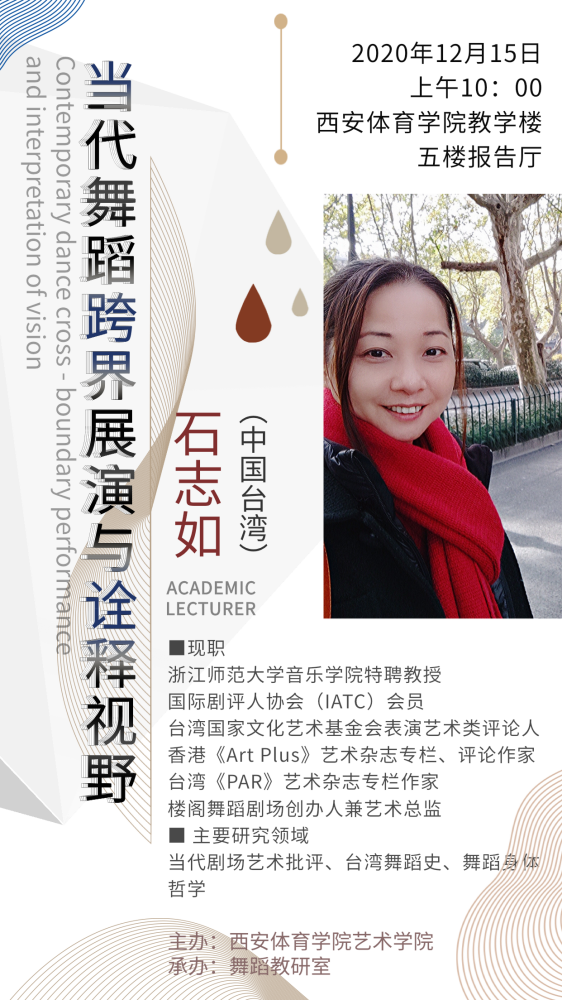 艺术学院邀请中国台湾艺术大学艺术学博士、浙江师范大学特聘教授、台湾楼阁舞蹈剧场创始人石志如老师于2020年12月15日为我院师生作学术讲座和舞蹈工作坊。此次活动由万象城allwincity官网艺术学院主办,舞蹈教研室承办(2020年舞蹈学第二课堂系列活动)