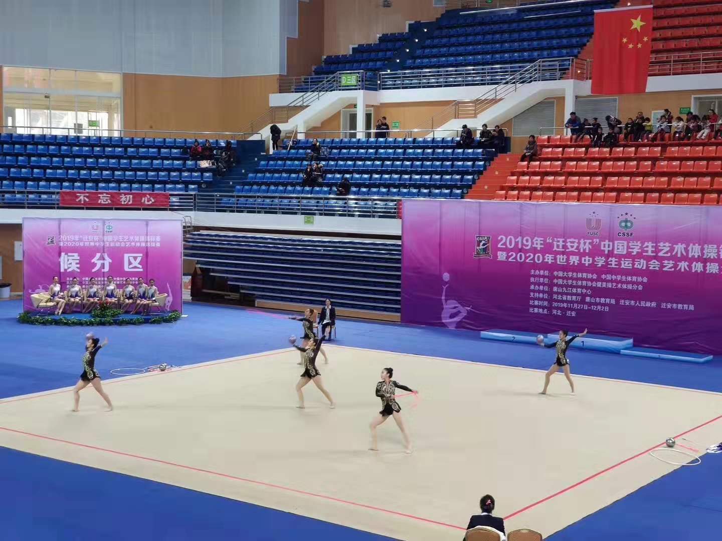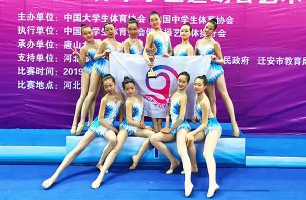 2019年11月27日-12月2日“中国学生艺术体操锦标赛暨2020年世界中国学生运动会艺术体操选拔赛”在河北迁安隆重开幕。本次大赛是由中国大学生体育协会、中国中学生体育协会主办,中国大学生健美操艺术体操分会执行,唐山九江体育中心承办的中国学生艺术体操最高级别的赛事,共有来自全国78所大、中、小学,共计785名运动员参加的本次大赛。万象城allwincity官网艺术体操队在本次大赛中凭借团队默契的合作、精准的配合,完美的表演,一举夺得体育院校A组集体全能冠军、三球二绳冠军、艺术集体操冠军、六级带操冠军、六级徒手亚军以及团体总分第三名的优异成绩。