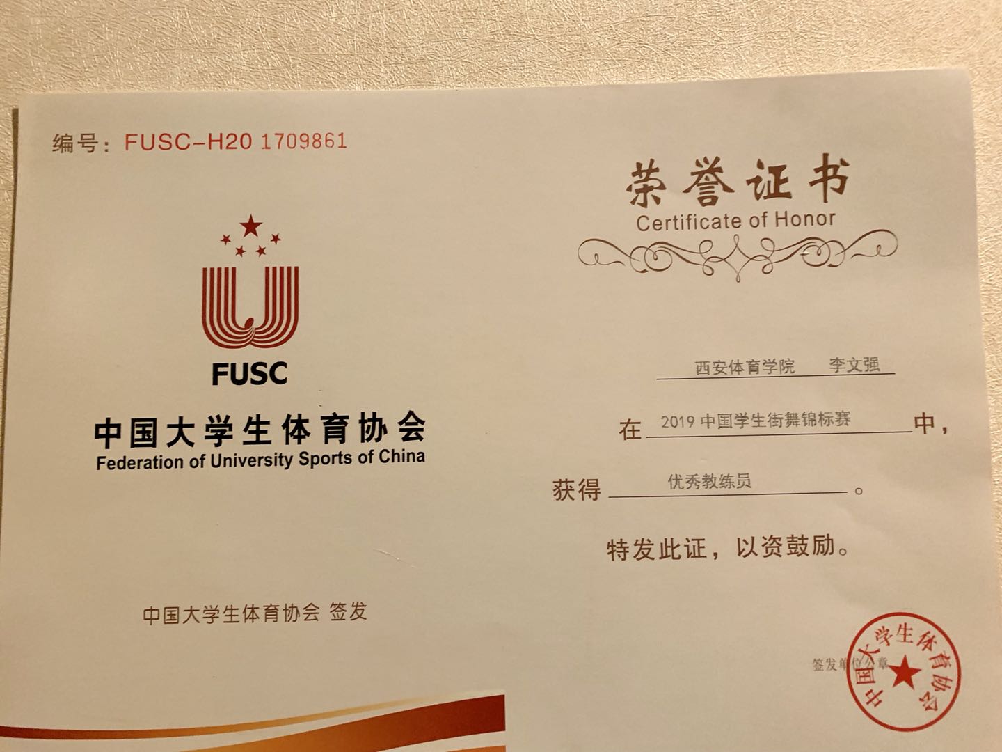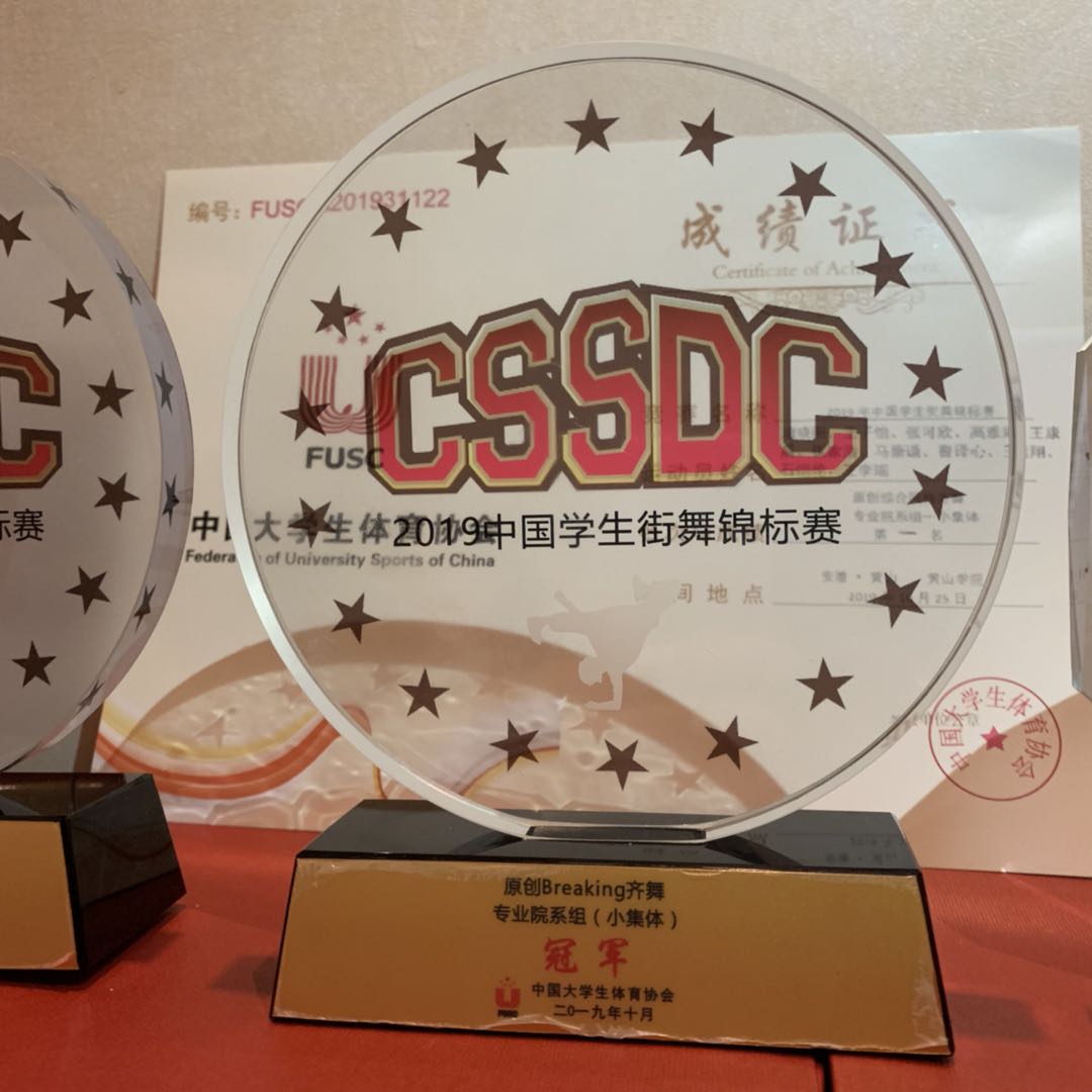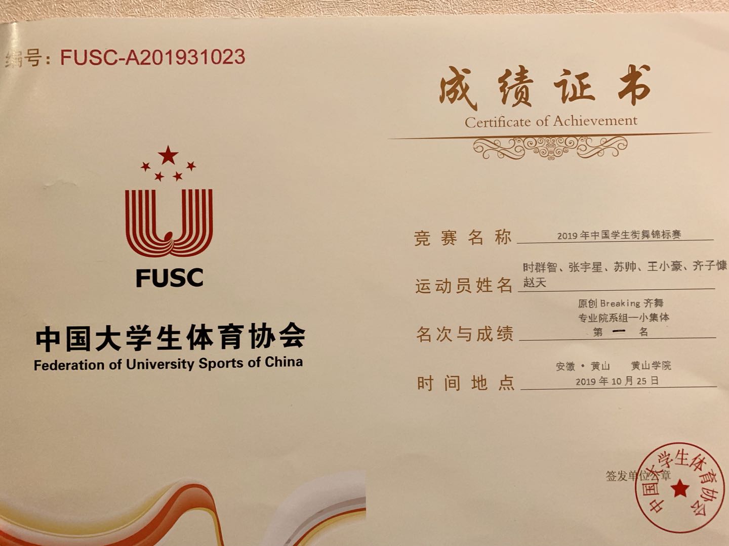 1028日晚,2019年中国学生街舞锦标赛闭幕式暨颁奖晚会在黄山学院体育馆隆重举行,圆满落幕。在此次大赛中,万象城allwincity官网李文强带领我院17名学生齐心协力、争创佳绩,喜获原创齐舞冠军、Breaking齐舞冠军、我院17级时群致获得1V1Breakingbattle冠军、4V4亚军。除此之外本次比赛李文强教师获得优秀教练员奖,队员时群致获得最佳人气奖,团体最佳创意奖、最佳编舞奖、最佳表演奖。张敏老师承担本次比赛裁判工作。