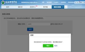 第二步:在“请输入别名”之后的录入框内自主设计并输入别名,点击“添加”。弹出“提醒”对话框,要求您确认自主设置的邮箱别名名称,别名添加后不允许再次自行修改,请检查后点击“确定”。