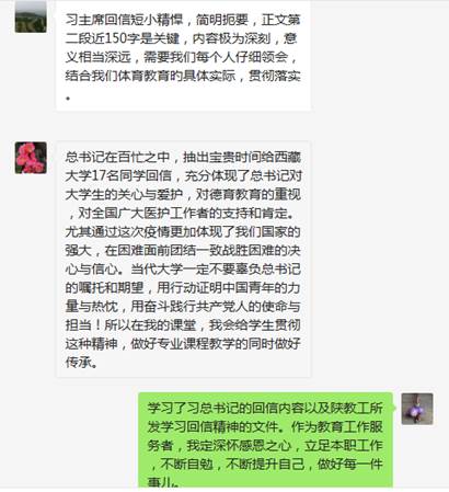 魏娟丽主任强调总书记抽出宝贵时间给西藏大学17名同学回信,充分体现了总书记对大学生的关心与爱护,对德育教育的重视,对全国广大医护工作者的支持和肯定。尤其通过这次疫情更加体现了我们国家的强大,在困难面前团结一致战胜困难的决心与信心。当代大学一定不要辜负总书记的嘱托和期望,用行动证明中国青年的力量与热忱,用奋斗践行共产党人的使命与担当!所以在我的课堂上,我会给学生贯彻这种精神,做好专业课程教学的同时做好传承。 对于落实立德树人根本任务具有十分重要的意义。