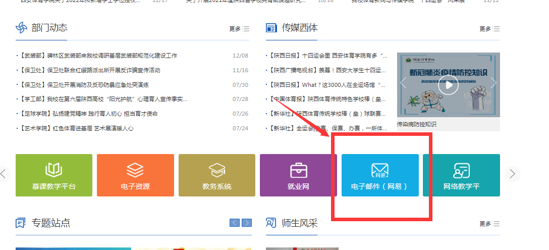 方式2:通过学校门户网站中的链接“电子邮件(网易)”(如下图所示),点击进入邮箱登陆界面,输入账号密码后即可使用校园云邮箱系统。