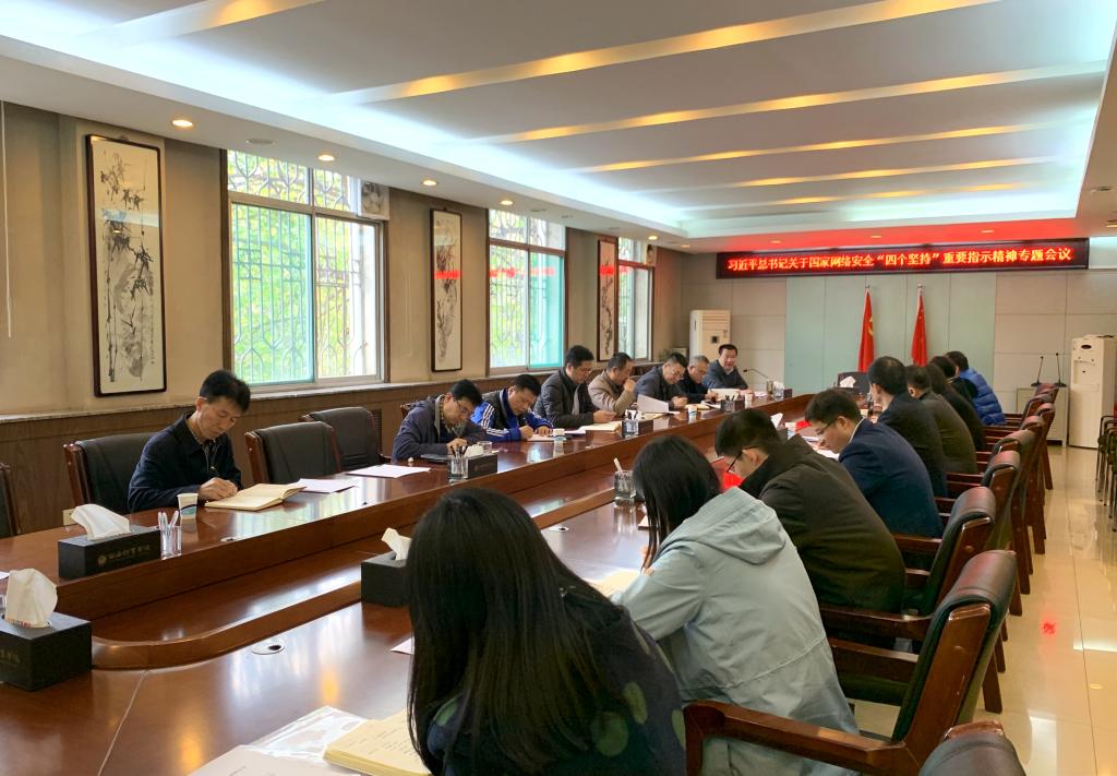 会议认真学习了习近平总书记关于国家网络安全“四个坚持”重要指示精神、习近平总书记关于网络安全和信息化工作系列重要论述以及《陕西省教育厅办公室关于学习贯彻习近平总书记关于国家网络安全“四个坚持”重要指示精神的通知》。会议还传达了陕西省2019年高校网络安全与信息化工作会议精神。