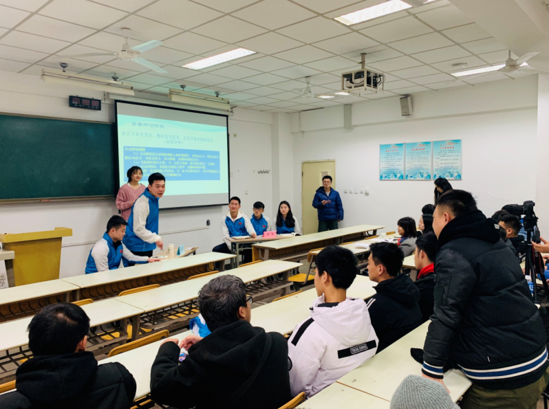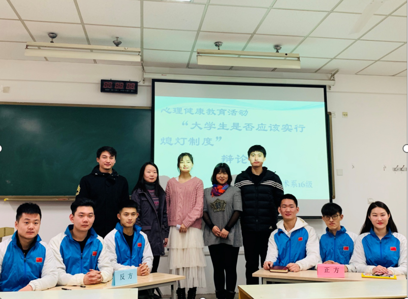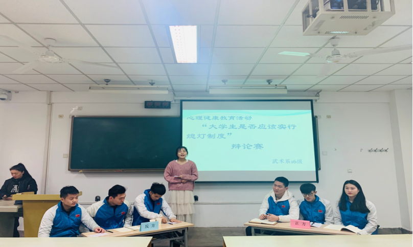 万象城allwincity官网武术系16级于二零一九年一月四号上午十点在108教室开展了以心理健康教育主题活动。以‘大学生是否应该实行熄灯制度’为主题开展了一场激烈的辩论赛。此次辩论赛除了16级全体同学,辅导员王华老师和赵佳鹏老师外,我们还有幸请到了学工部心理健康教研室刑美辰主任和苏丹宁老师。