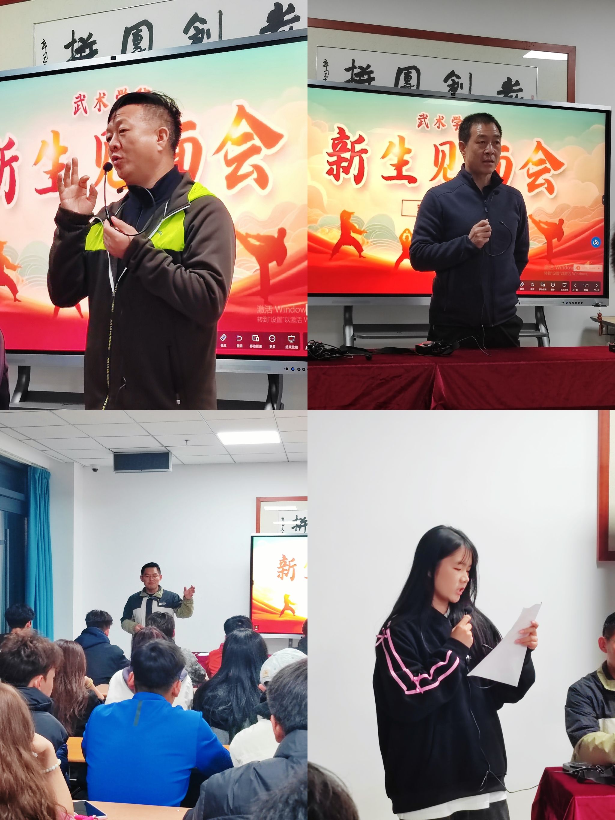 为了增进师生间的彼此了解,帮助24级新生更好地融入武术学院大家庭中,10月30日晚上19点,武术学院在橄榄球馆301教室召开了新生见面会。武术学院党总支书记刘耀荣,副院长李正恩,24级辅导员贺去非出席此次会议。