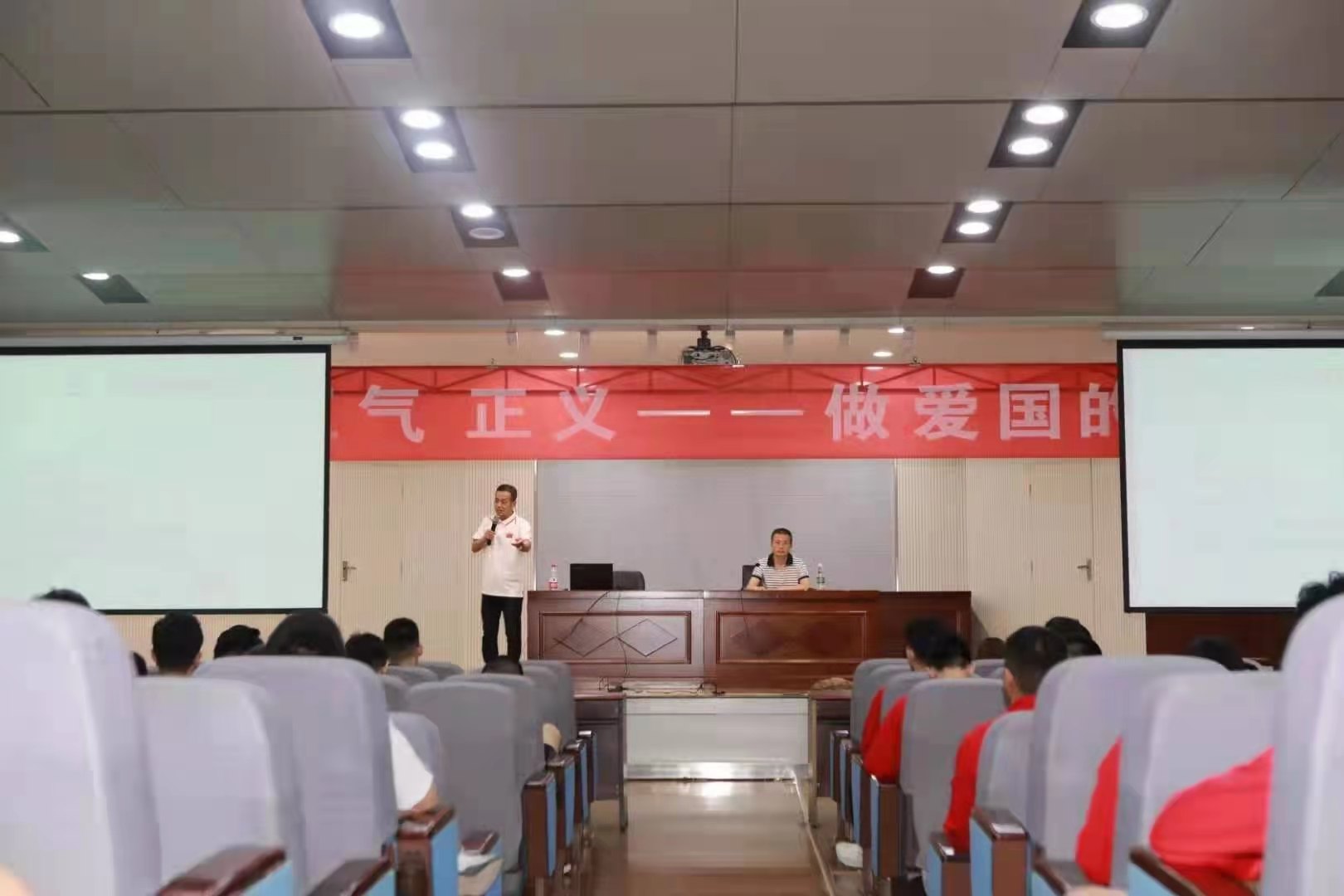 5月27日晚,武术学院套路教研室马文国老师在教学楼一楼报告厅为武术学院学生作“正直、正气、正义——做爱国的武术人”专题讲座。讲座由武术学院党总支书记朱舰主持。
